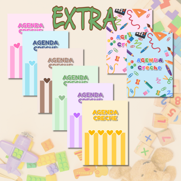 Na compra do arquivo digital do miolo para agenda creche, você estará ganhando alguns modelinhos de capas (cada opção tem capa e contracapa). Na contracapa você pode colocar o seu logo ou usar para colocar decoração de sua preferência.