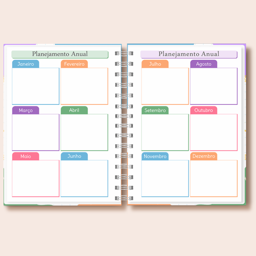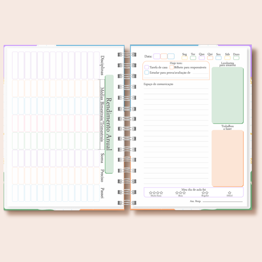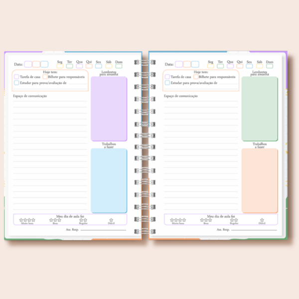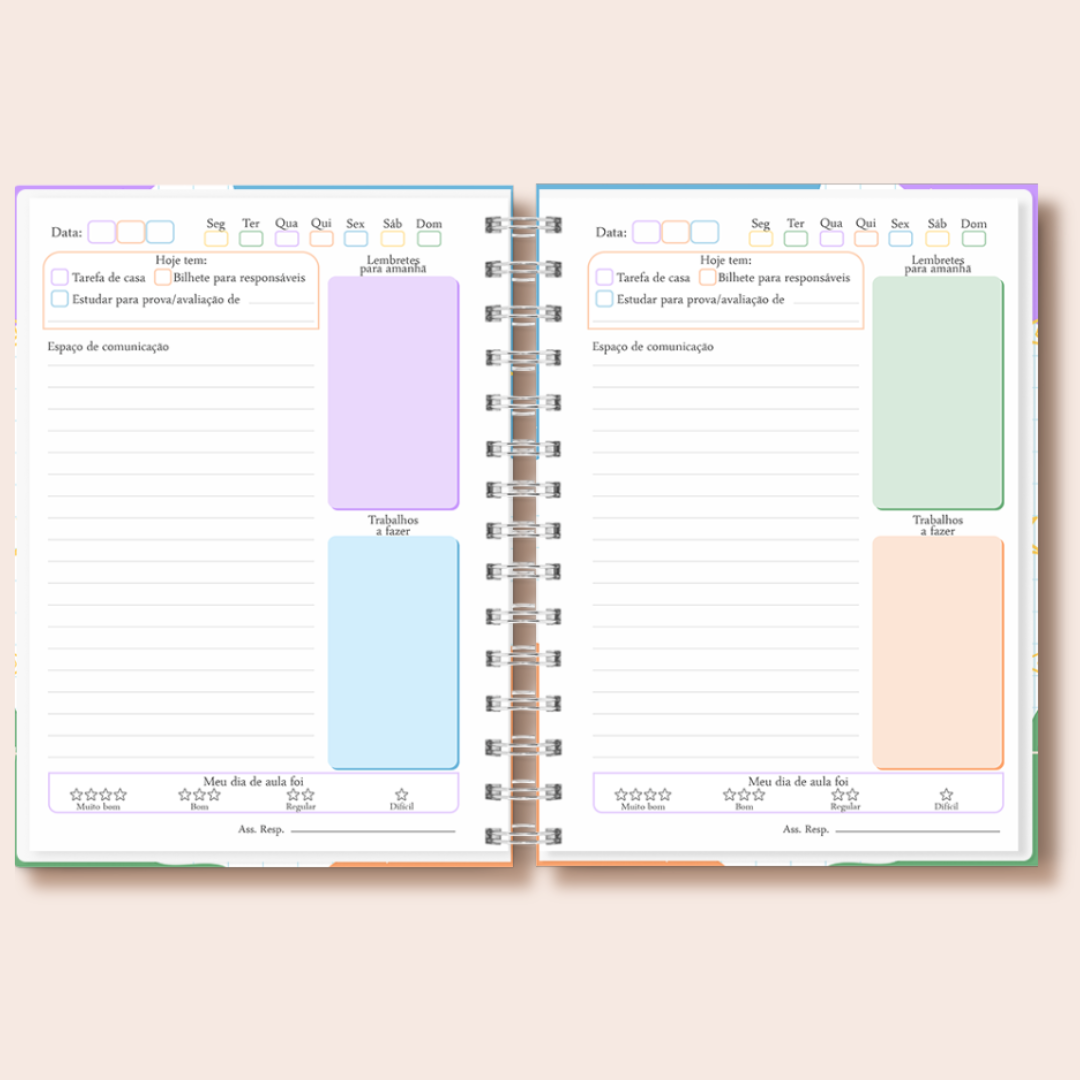 • Miolo diário com espaço para tarefas, comunicação e avaliação do dia.