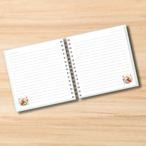 As páginas possuem elemento decorativo sutil que reflete o tema da capa, através de um pequeno desenho, tornando cada anotação uma extensão visual da capa do caderno.