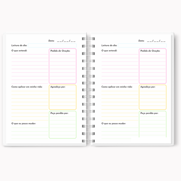 Folhas com espaço para leitura do dia (leitura livre), reflexão, pedido de oração, agradecimento, aprendizado e aplicação.